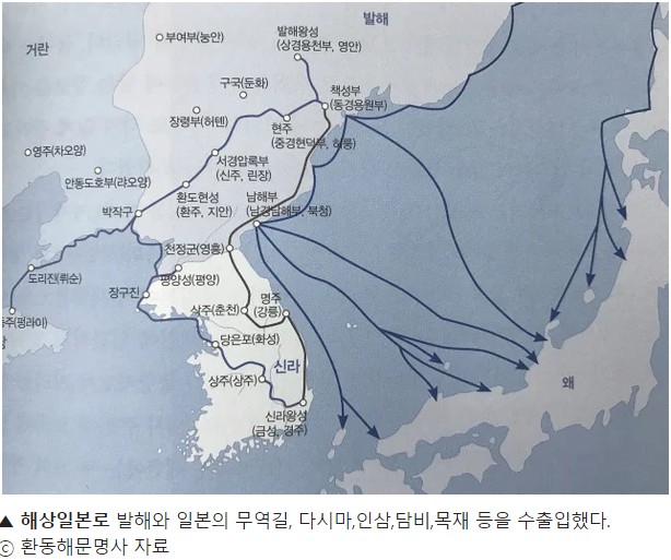 발해(渤海)와 일본(日本)과의 외교 관계는 727년(발해 무왕 인안 8년) 8월 발해에서 처음으로 사신을 파견하여 국교(國交)를 맺으면서 시작되었다. 발해가 일본과 국교를 맺은 것은 당시에 당나라(唐)와 신라(新羅) 등과 대립하고 있던 상황이었는데 그러자 발해는 일본과 통교하여 신라를 정치적으로 견제하고자 했던것 같다. 이후 발해와 일본 두 나라 사이에는 사신(使臣)들의 왕래가 비교적으로 활발하여 920년까지 발해 사신이 일본으로 30여 차례에 오고 갔다. 양국은 사신이 오고 갈 때 예물 교환 형식으로 또는 상인들의 직접 교역 형식으로 교역을 행했는데 발해의 주요 수출품은 공예품과 범(호랑이) 가죽 등을 비롯한 각종 동물 털 가죽, 인삼 등 약재류 등이었다. 발해의 수입품은 비단을 비롯한 직물과 수은, 옻 등이었다. 일본은 이러한 교류를 통해 발해 문화에 많은 영향을 받았다. 일본은 발해에 유학생을 파견하여 발해어(語)와 발해 음악(音樂)을 배워갔다. 발해 음악은 이후 일본 음악의 발전에 영향을 주었다. 8세기에 들어서서 발해에서 일본에 전해준 선명력(宣明曆)은 그 후 일본에서 800여 년 동안 통상적으로 사용되었다. 당서(唐書)의 발해전에는 발해 남쪽 바다에 다시마 해조류가 있고 이것을 당나라에 수출한다고 기록하고 있다. 만기요람(1808년) 문헌에는 다시마는 대구, 해삼, 홍합과 명나라(明)에 조공으로 바쳐졌다. 특히 발해는 자국산의 다시마 뿐만 아니라 일본산 다시마의 중계 무역에도 활약하였을 것으로 알려져 있다. 조선선사에서는 발해에서 일본과 교류 때 남경남해부는 신라로 가는 길목이었으며 다시마의 산지였다라고 기록되어 있다. 건국 후에 발해는 일본과 통교하려고 시도했다. 발해 건국 30년째인 727년 8월에 일본으로 처음 사신을 보내어 국교를 맺었고 이때부터 발해가 멸망할 때까지 약 200여년 동안 발해사 34회, 견발해사 12회 등 빈번한 교류가 있게 되었다. 발해는 일본의 신라 침략 동맹 공격 계획은 거절하기도 했다. 일본으로 가는 통로는 부산 쪽까지 내려가서 대한해협을 바다를 건너가는 것이 가장 가깝고 안전한 이동길이었다. 조선시대의 조선통신사도 대한해협을 통해서 갔지만 그럼에도 불구하고 날씨가 좋지 않고 바닷길이 험해서 고생 고생한 기록도 남아있다. 다른 이동길로는 제3국인 신라의 영토 지역이었기 때문에 발해는 동해 바다 한가운데를 그대로 건너는 루트로 일본에 도착한 것으로 보인다. 발해 사신단의 주요 목적지는 일본 호쿠리쿠 지역 노토 반도 등 카가 지방으로 이 지방에서는 이사카와현 누가미마치 유적이나 고마츠 시 시바야마가타에서 발굴된 한국 고유 난방 시설인 온돌이 포함된 집 등 발해인과의 교류 흔적이 발견되었다. 첫 번째 사신단은 서기 727년인 인안 9년 무왕 시기에 일본으로 파견되었는데 이들의 목적은 일본에 발해가 고구려를 계승했음을 알리고 대외적으로 알렸다. 첫 번째 사신단은 영원장군, 낭장 고인의, 고제덕 등 24인의 무장으로 구성되었는데 사신 파견의 목적이 군사적임을 알 수 있다. 이 사신들은 표류하여 도착한 곳에서 일부가 살해되었고 12월에는 수도 헤이조쿄에 당도하여 728년 정월 쇼무 천황을 만나서 선물을 전달하였다. 속일본기의 기록에는 "발해가 고구려의 옛 영토를 회복하고 부여의 풍속을 간직하고 있다(復高麗之舊居 有夫餘之遺俗)"라고 쓰여 있다. 발해의 두 번째 대일(對日) 사신은 발해의 당나라 공격 이후 당나라와의 외교관계가 회복되지 않은 상황에서 신라를 견제하기 위한 목적으로 파견되었다. 발해 사절단은 선물을 교환하고 활쏘기 대사례에 참석하였으며 발해악을 최초로 일본에서 연주하였다. 이 사절단을 맞이한 통역관은 신라학어(新羅學語)라 불리는 일본어를 배우기 위해 일본에 유학해 있던 신라인 학생들이었는데 신라인 역관(譯官)이 발해인들의 말을 통역하였다는 점에서 발해와 신라의 언어가 비슷했다는 주장도 제기되었다. 발해의 세 번째 대일 사신은 서기 752년 대흥 15년 문왕 시기에 보국대장군 모시몽(慕施蒙)을 파견하였다. 당시 일본은 과거에 고구려가 신하로써 예의를 취했다는 것을 근거로 발해가 일본에 신하로 칭하지 않음을 문제로 삼았는데 정확히는 대신라견제책을 모색하고자 고구려쪽에서 형제국임을 알렸다. 일본은 758년에 신라정토계획을 세우던 중 발해를 끌어들이기 위해 처음으로 사신을 파견했다. 발해는 양승경(楊承慶)과 양태사(楊泰師), 풍방례(馮方禮) 등을 일본에 보내어 답방했다. 하지만 발해는 당나라의 안사의 난 이후 요동 안정에 더 관심을 가지게 되었고 당나라 또한 발해를 발해군왕에서 발해국왕으로 책봉하는 등 발해와 화친하면서 동아시아에 평화분위기가 조성되었다. 일본은 8세기 후반 신라와 관계가 나빠져 공식 교류가 중단되었는데 하지만 전라남도 완도 지역에 해양 군사 집단으로 청해진(淸海鎭)이 있던 장보고가 무역상을 자처했고 이러한 분위기 속에서 신라와 일본의 사무역(私貿易)은 계속해서 이어졌다. 838년에 일본에서 당나라에 바다길로 오고 가던 견당사(遣唐使)가 중지되었다.